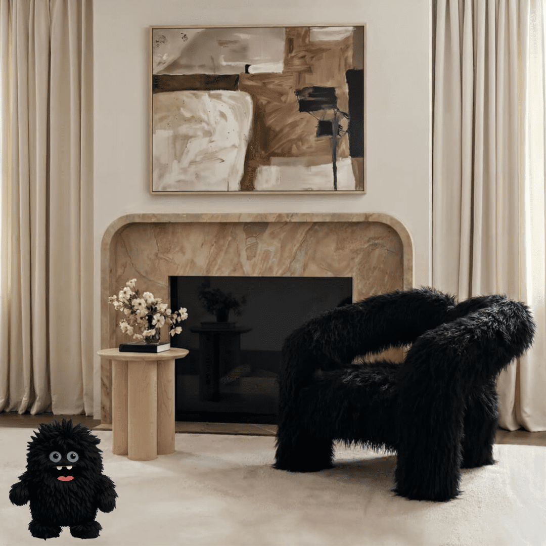 The sensational Bigfoot Jet Chair is upholstered in faux black Mongolian fur, creating a bold, tactile statement. Designed as an extra-large accent chair, it features a striking curved three-leg base that enhances its modern silhouette. A true statement piece, it brings contemporary drama and comfort to any interior.