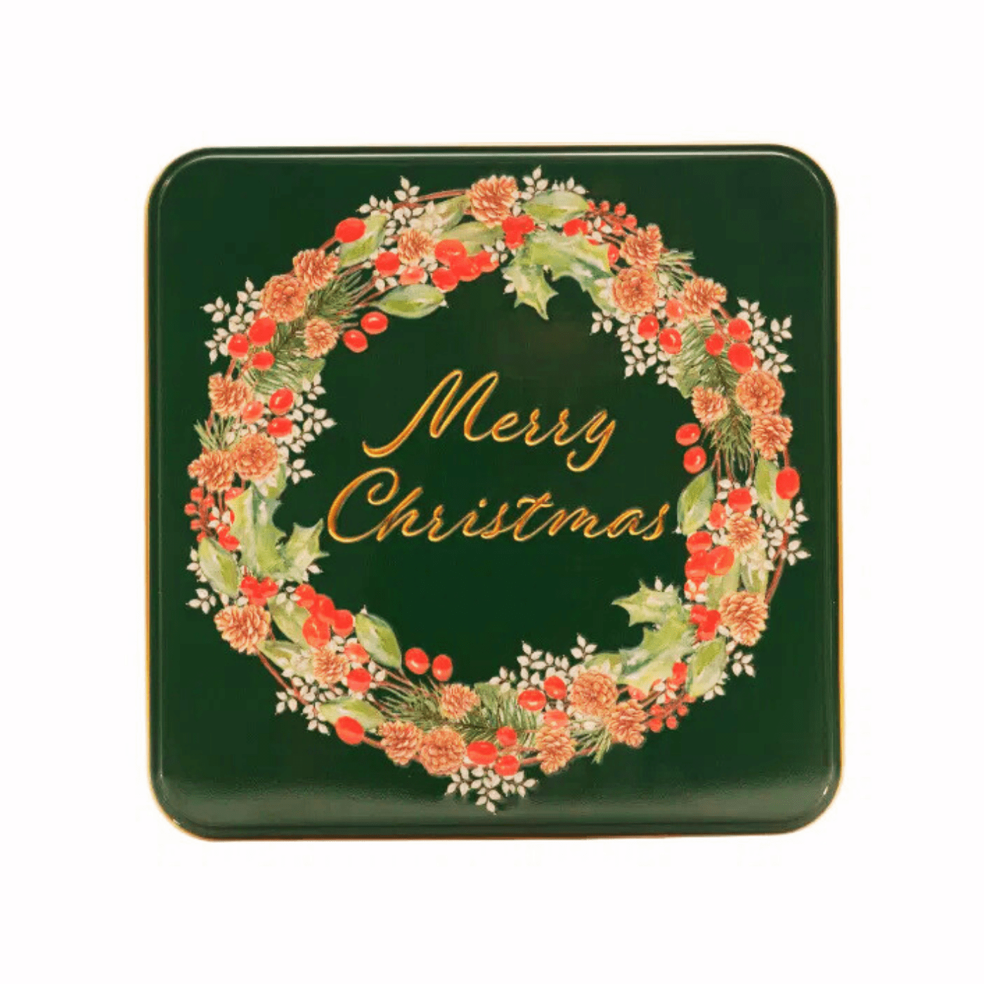 This Christmas Wreath Festive Collection Tin features a large, heavily embossed square tin in green, red, and gold, and is filled with a variety of traditional, hand-packed Christmas biscuits.