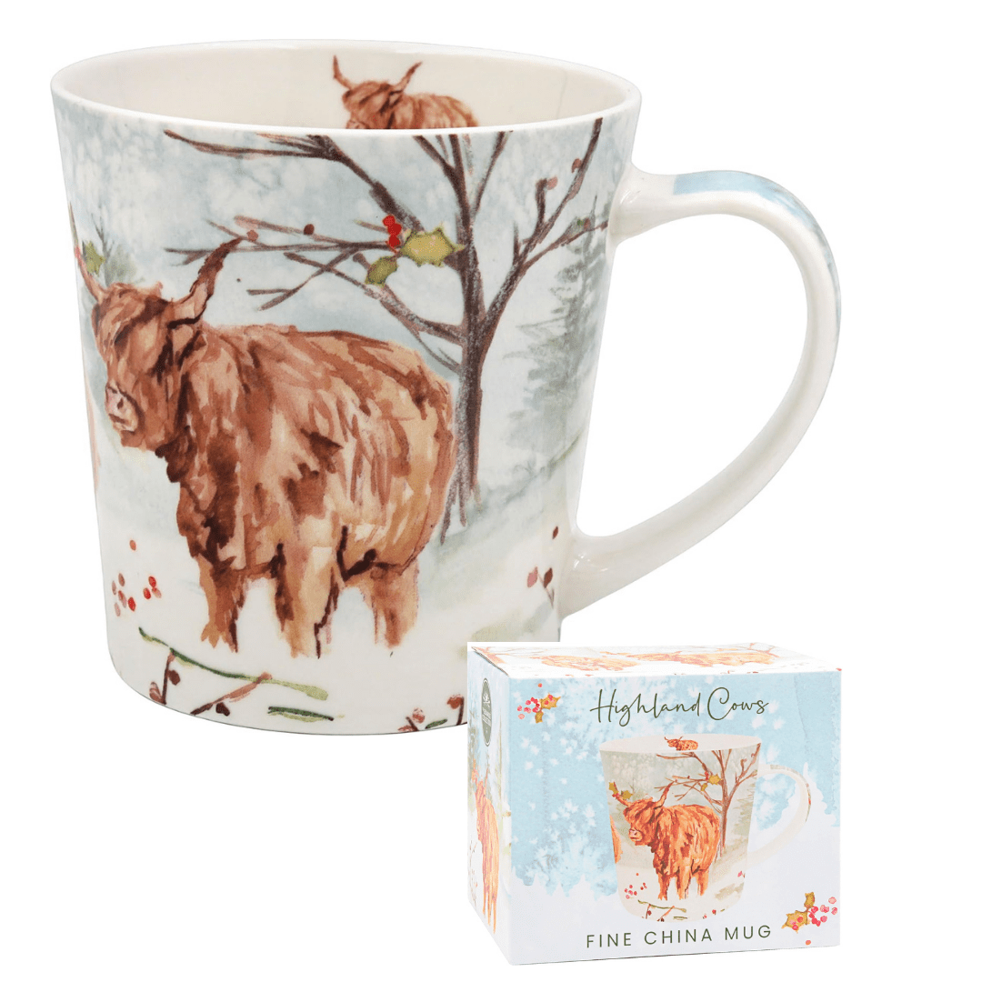 This beautiful festive fine china mug is perfect for enjoying coffee or tea during the holidays or at any other time. With a charming Highland Cow motif, this mug will bring warmth and cheer to every sip at home or in the office. Perfect for Secret Santa!